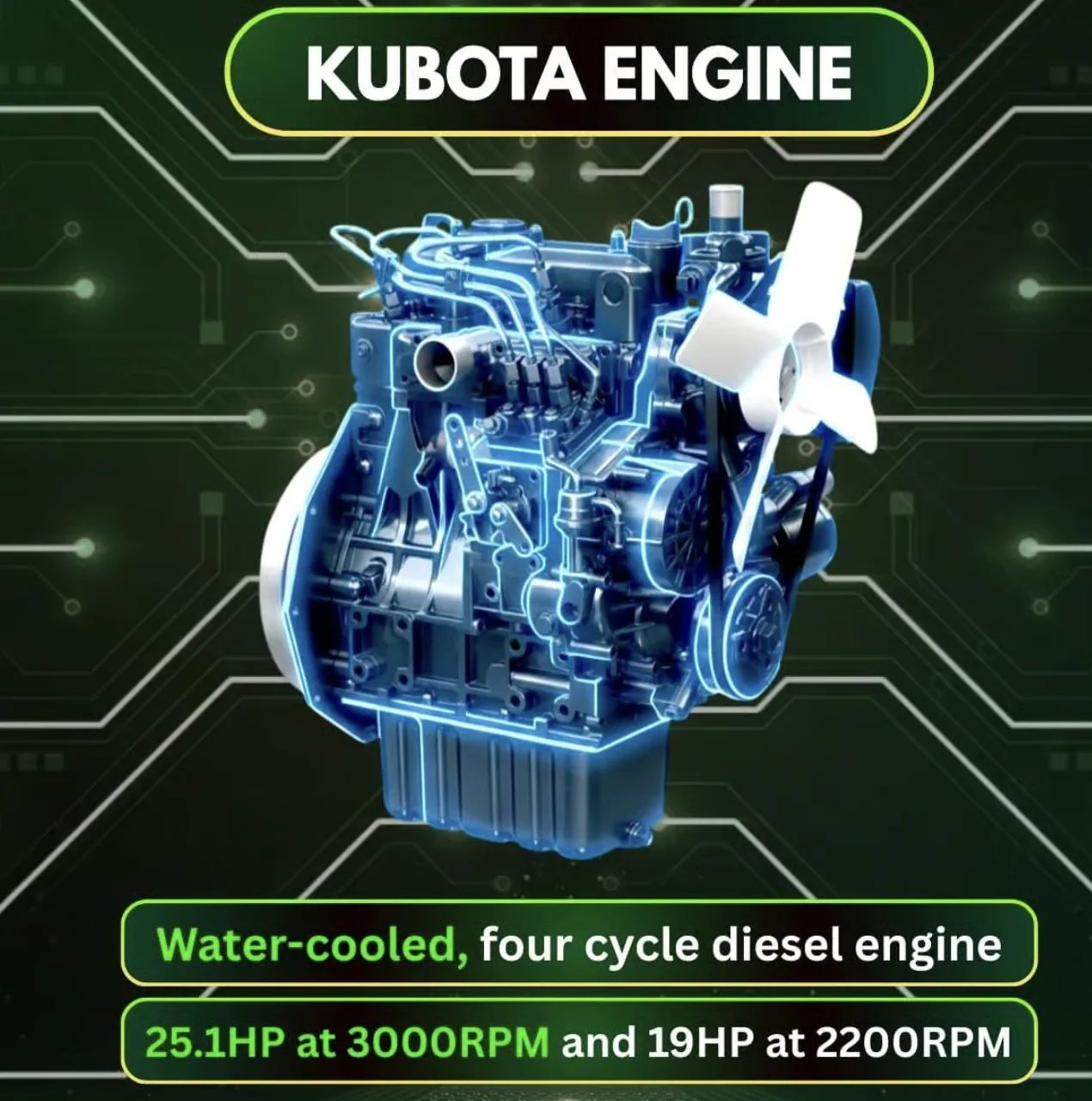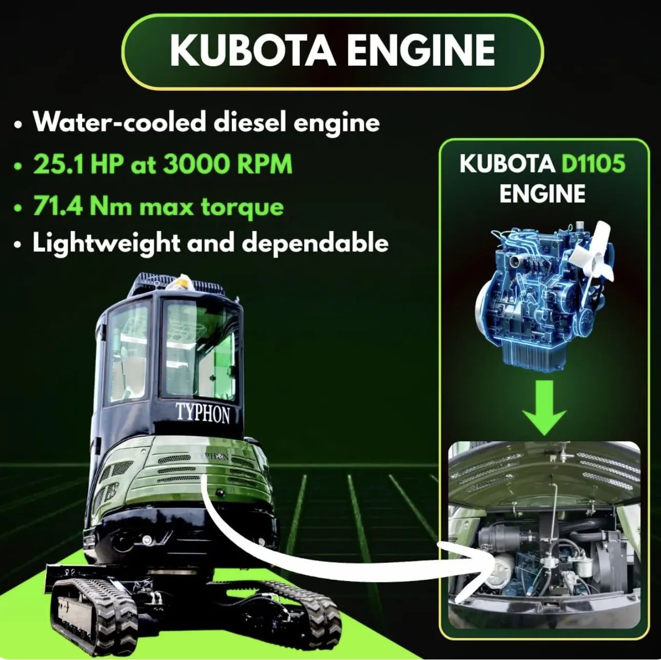 TERROR XXV Prestige comes with a powerful Kubota D1105, a vertical, water-cooled, 4-cycle diesel engine with a capacity of 25.1HP at 3000RPM and 19HP at 2200RPM. Lightweight, dependable and versatile. At 2200 rpm, a Kubota D1105 engine produces a maximum torque of 71.4Nm (52.7lb-ft)