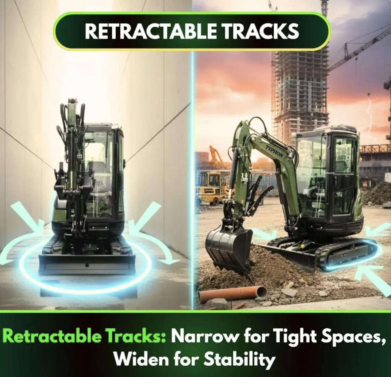 The TYPHON TERROR XXV Prestige mini excavator is designed for areas where larger machines cannot fit. With its compact profile (Total width 1400mm, overall height 2530mm) and agile movement, it easily navigates narrow job sites, residential areas, and indoor construction zones. Its powerful Hydraulic System ensures smooth digging, trenching, and maneuvering, even in the most confined spaces.