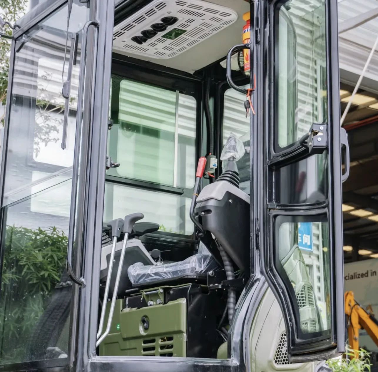 This mini excavator features a smooth Hydraulic System with Pilot Controls, plus a comfortable AC/Heated Cabin for all-weather operation. It includes a Boom Swing (45° left and right) , Retractable Tracks, 450mm Bucket, Hydraulic Thumb Clip and 145 mm ground clearance, giving you precision, versatility, and stable performance in tight or rough environments. Cabin interior measures 900mm in width and 1600mm in height, providing ample space and comfort for the operator during long working hours.